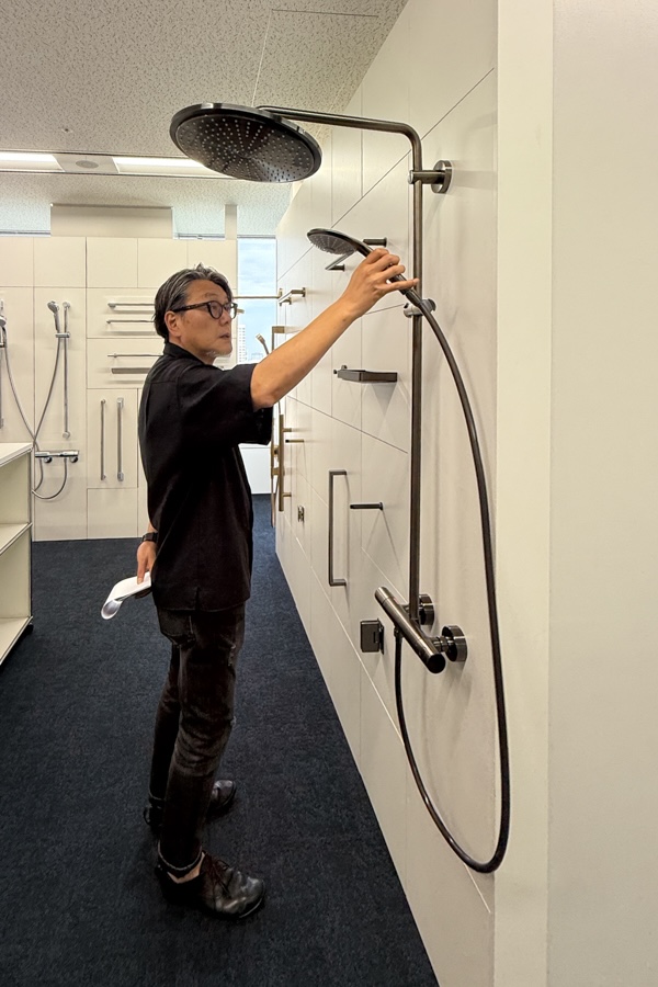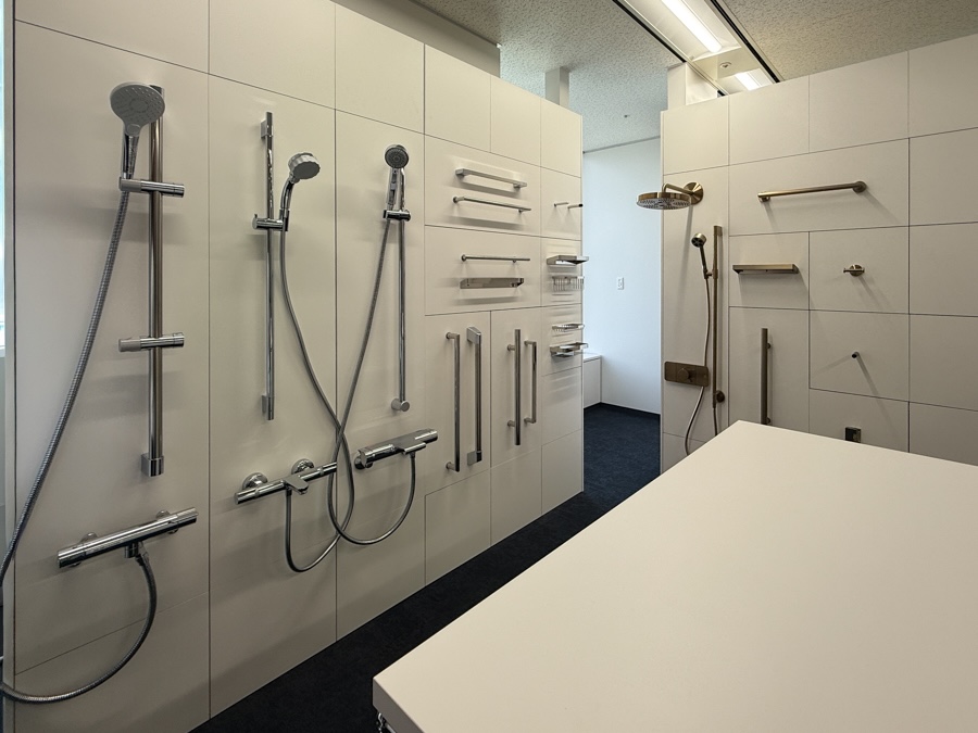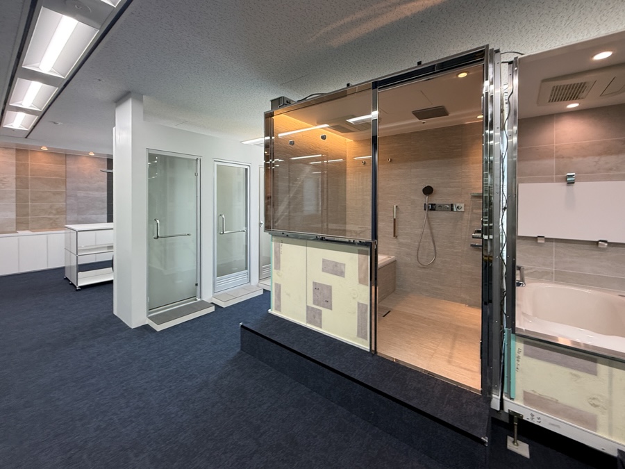 実際のユニットバスの展示をはじめ、ドアのサンプル、タイル、水栓金物、バスタブなど、オーダーメイドで空間をつくるための素材サンプルが豊富に揃っており、設計に活かせるヒントを多く得ることができました。