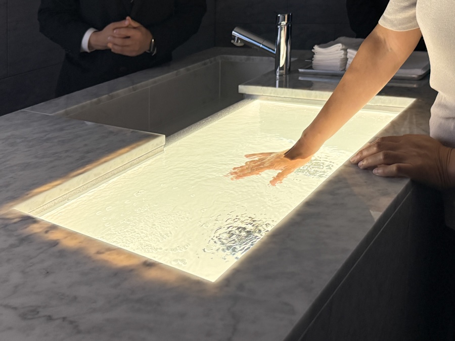 炭酸泉をフィーチャーしたバーカウンターエリアも印象的でした。高濃度炭酸ガスを溶け込ませた湯に実際に手をかざし、その効果を体感できる仕掛けは、製品の特徴をリアルに伝えるユニークな演出でした。
