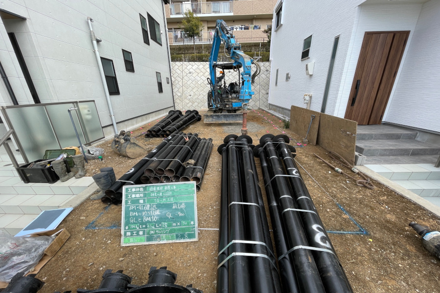本日より、杭工事が開始です。本杭工事に先駆けて行う試験杭の確認を現場で行いました。