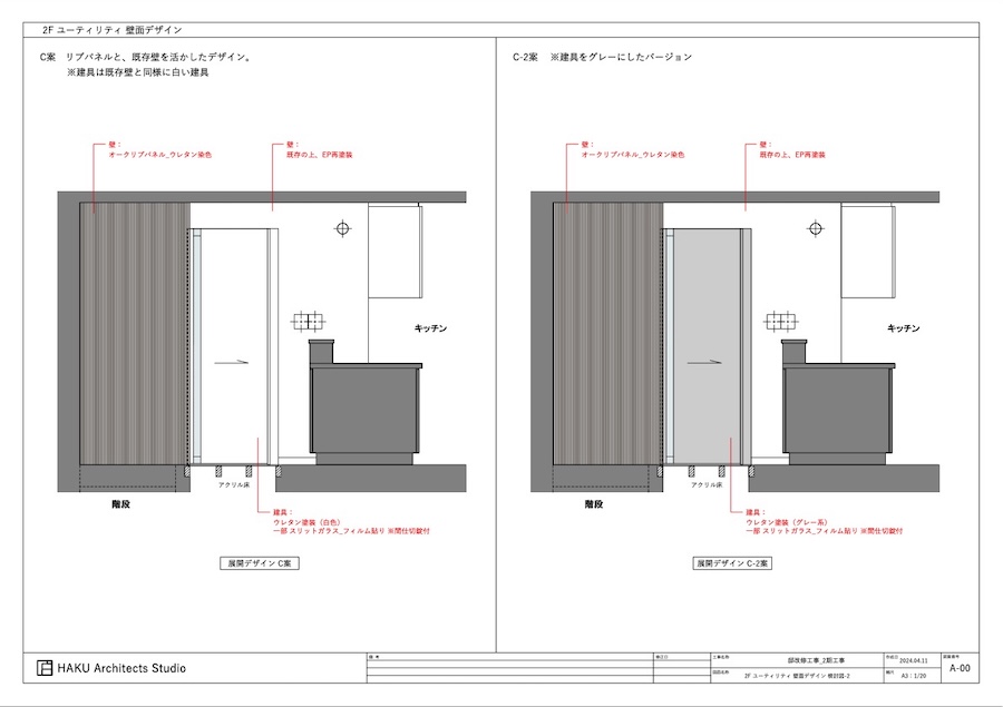 C案、D案はリプバネルを建具の際までとしています。C案は建具は既存の壁と合わせて白色に、D案は建具をグレー色にしてアクセントをつけた案です。