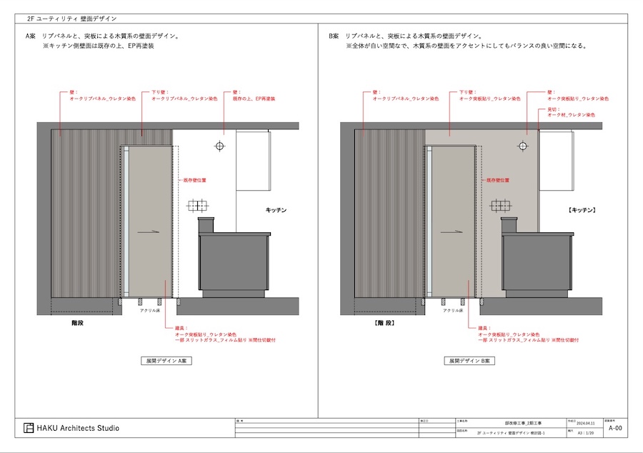 A案は、リプバネルと天然木の突板パネル、建具も天然木の突板を使う案です。建具の切り替え部分で壁を白い塗装色にしています。
