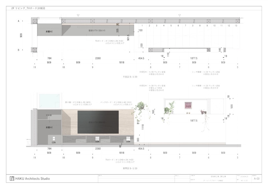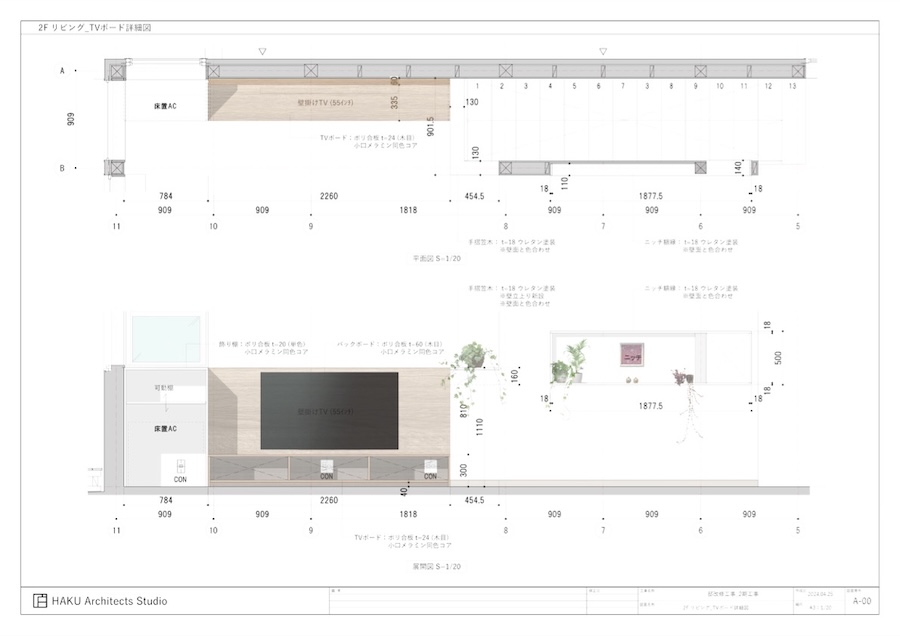 A案は、壁掛けテレビ用のバックパネルとテレビボードは木質系、隣の飾り棚兼床置きエアコン収納は白いキャビネットにするデザインです。ダイニング側の壁面ニッチの方は、四周の額縁を壁の色と合わせた白色とすることで、周辺の雰囲気に馴染ませた案です。