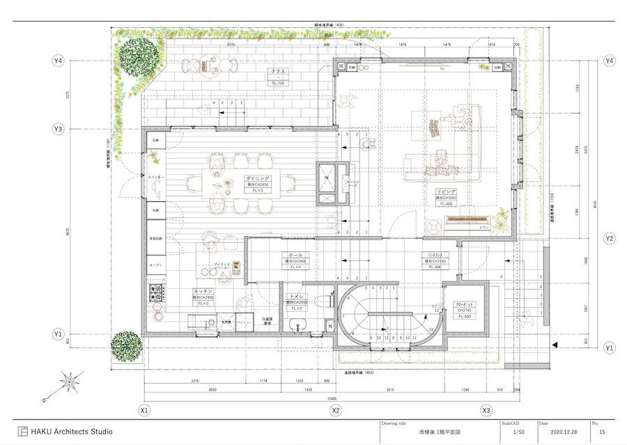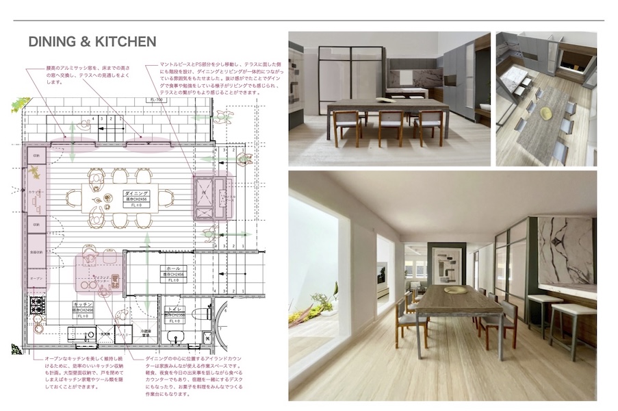 キッチンはオープンなデザインを維持しながら、大型収納や家電収納スペースを確保。マントルピースとPS部分を少し移動させ、テラスに面した側にも階段を設けることで、ダイニングとリビングの一体感をさらに高めています。