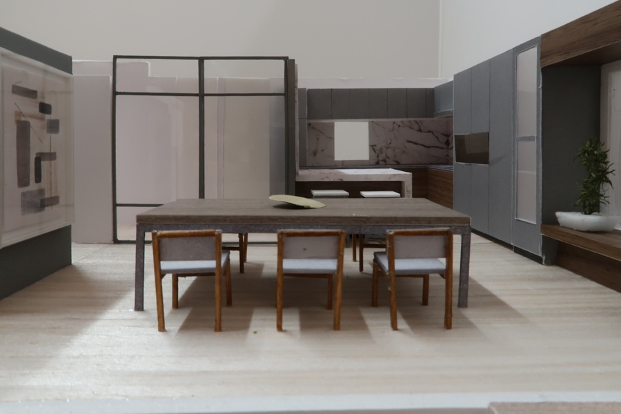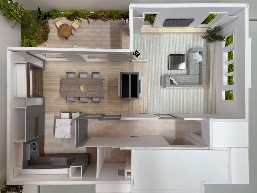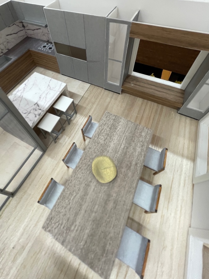 今回の模型は、床・壁・キッチンまわりの素材感を丁寧に再現しています。木質系の床材のトーン、大理石調のキッチンカウンター、グレーを基調としたソファや建具——それぞれの素材が組み合わさったときの空間の印象を、模型を通じてご確認いただきました。