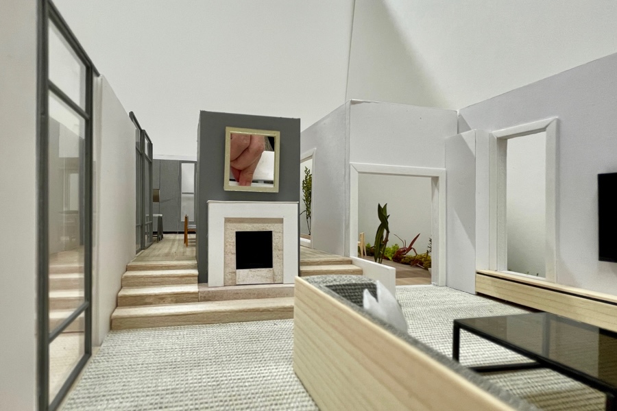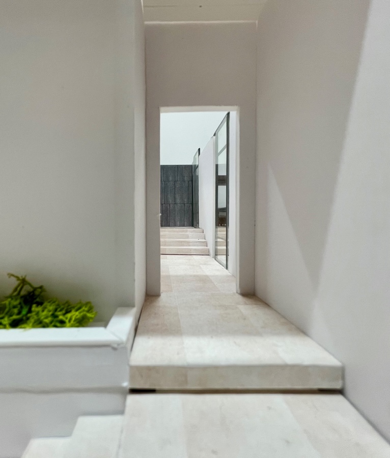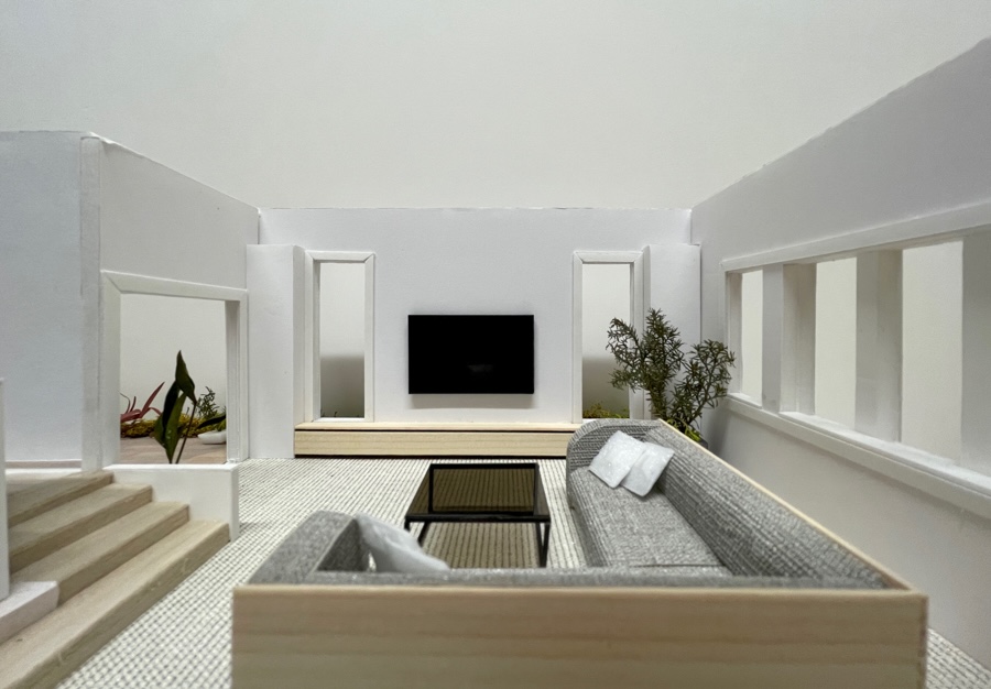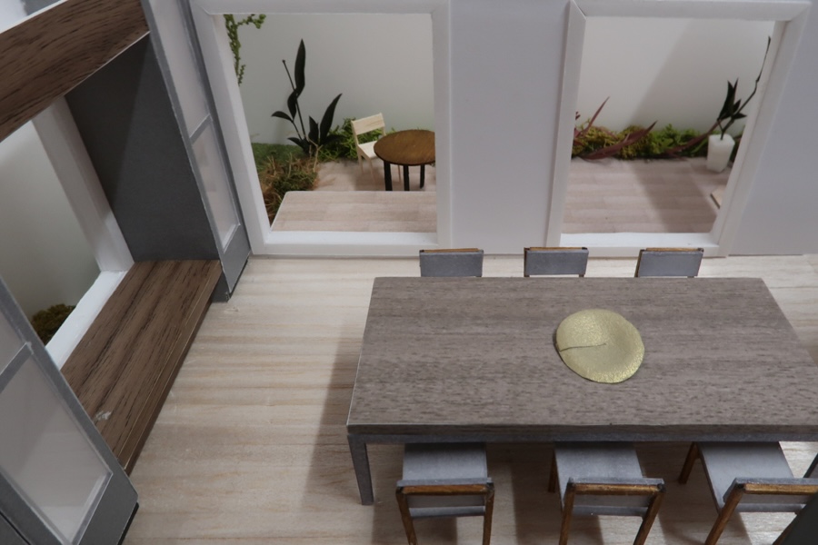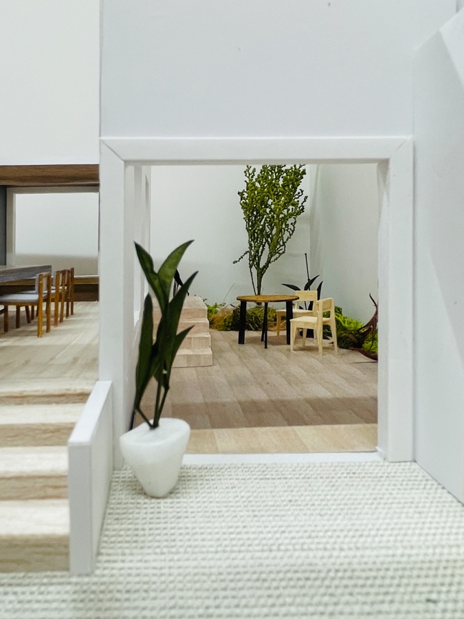 玄関に入ると、ホールを通して見える景色です。最初に家に入った時の印象がどんな雰囲気になるか、模型で確認していただきました。