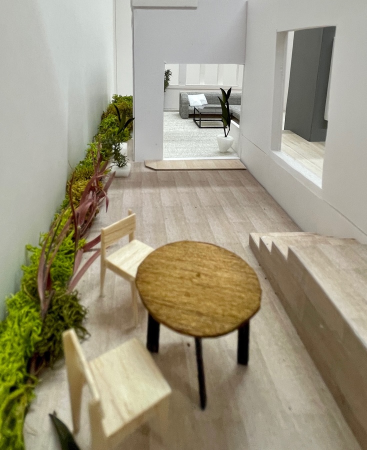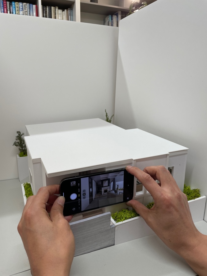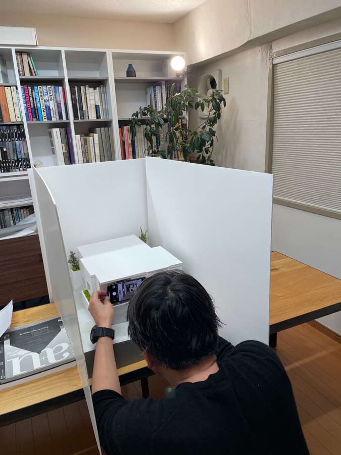 模型の周囲を白いボードで囲って、iPhoneで撮影しています。昔はマクロ用のレンズを使ってカメラで撮影していましたが、最近のiPhoneカメラは優秀ですね。縦横の歪みや画質調整をすれば、かなりリアルに空間が表現できます。