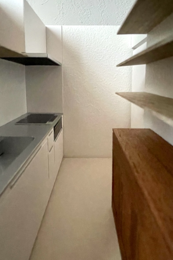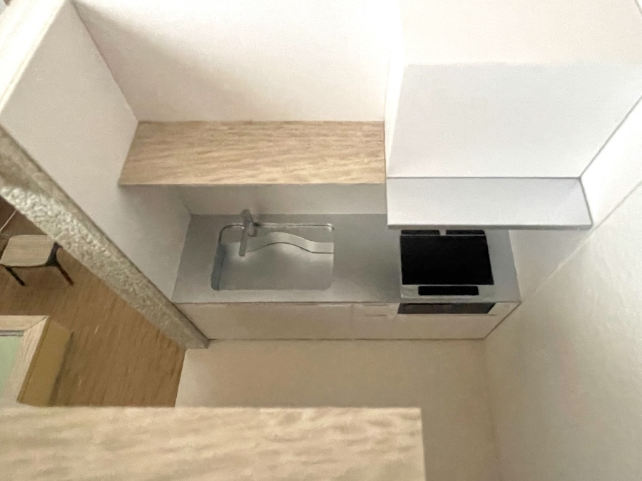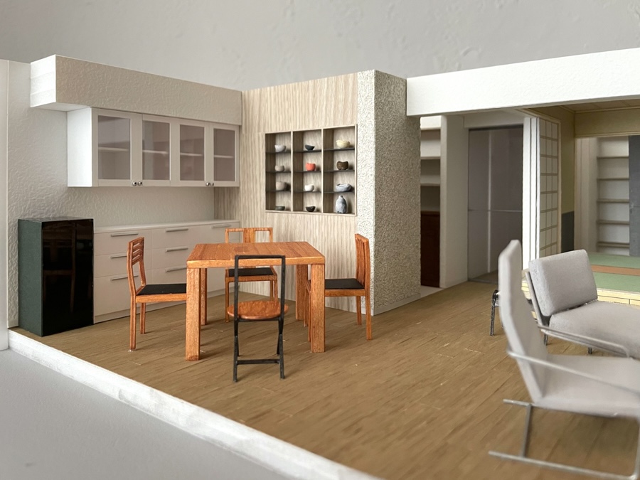 キッチンも更新をすることになっています。システムキッチンと組み合わせて棚やお持ちの家具を置いたイメージを模型でも再現してみました。