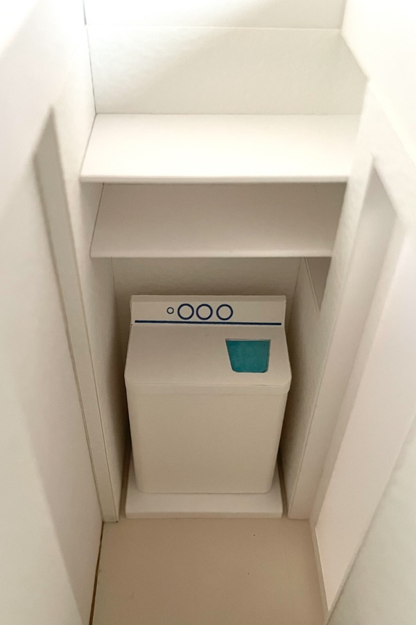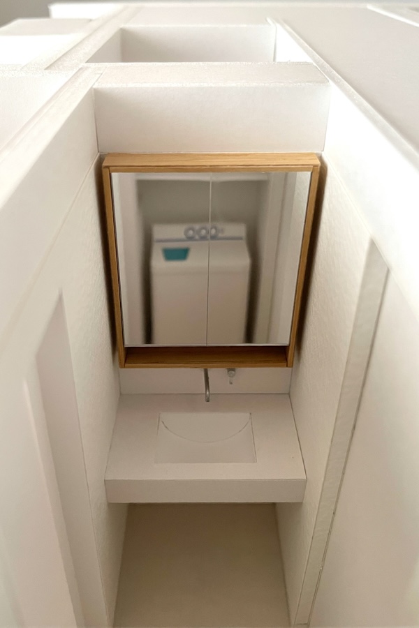 洗面脱衣室も細部までリアルに制作しています。二槽式洗濯機を導入したいとお聞きしていたため、事前に品番をお知らせいただき、実際のサイズ感で置いたときの印象を模型で表現しました。寸法の確認だけでなく、空間全体のバランスを確認していただけました。
