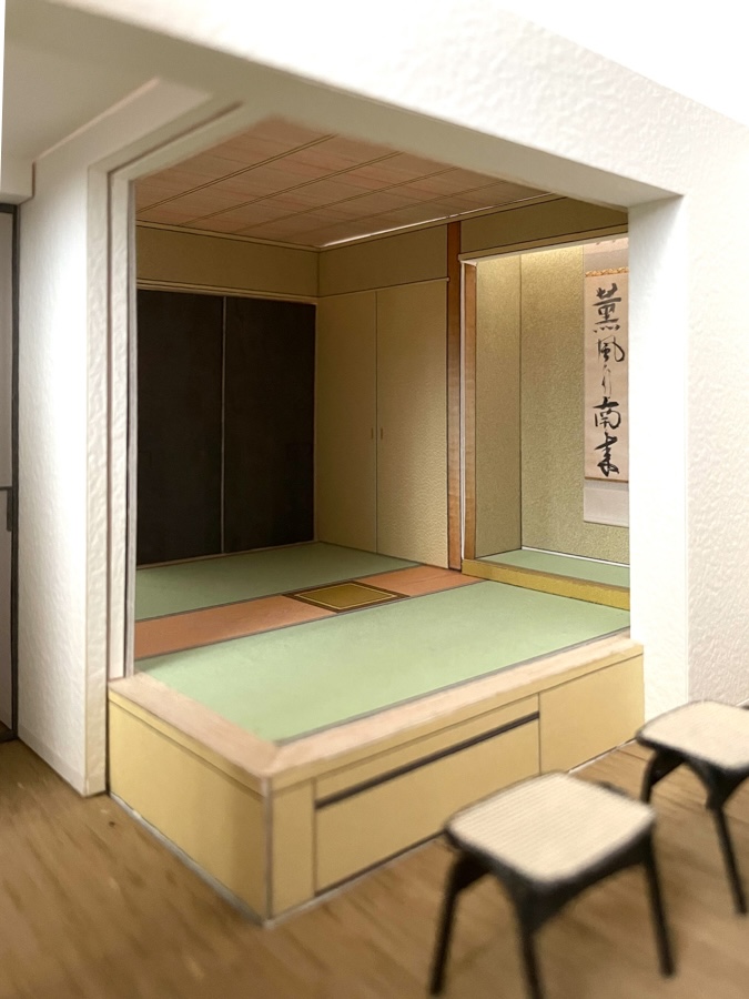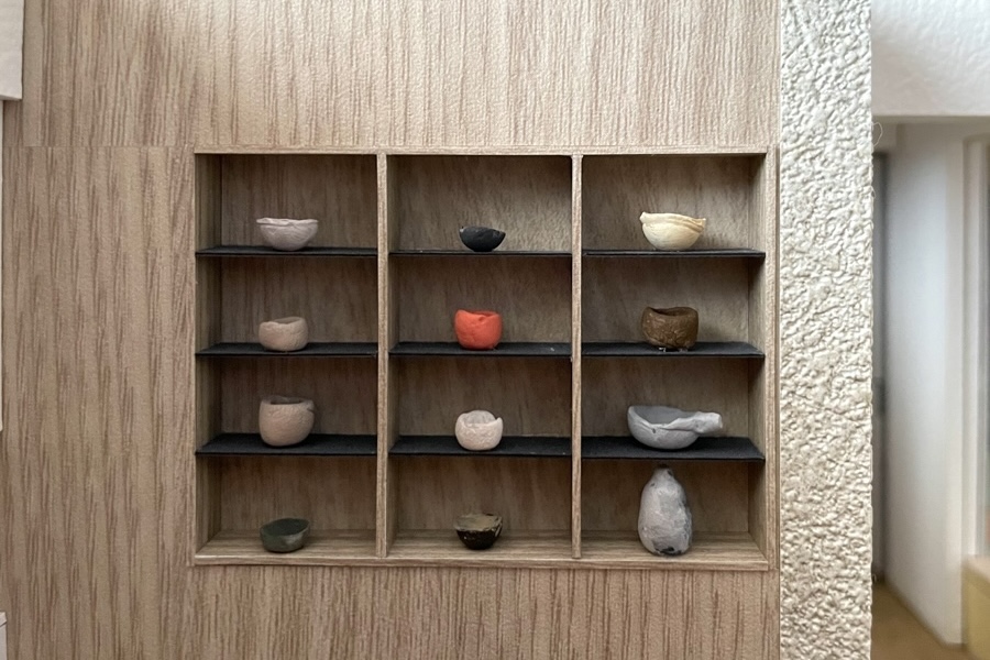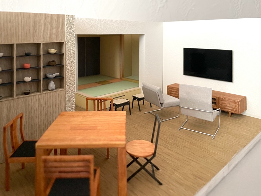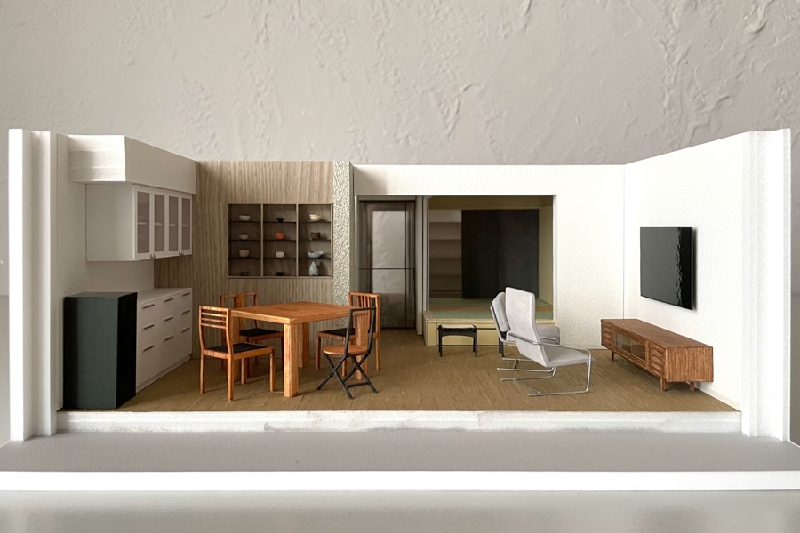 今回のプロジェクトは、「リビングダイニングに面した一角をお茶室にしたい」というご要望が、設計の出発点にありました。そのお茶室の設計を担当されている岩崎建築研究室の岩崎さんが模型を制作してくださいました。岩崎さんがお施主様へお茶室の模型をご覧いただいた後、本体の模型を制作する際にその模型をお借りして型取りを行い、お茶室部分だけ取り外しができるよう分けて制作しています。模型同士が連携したつくりになっており、空間全体のつながりもご確認いただけるようになっています。