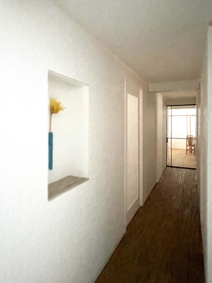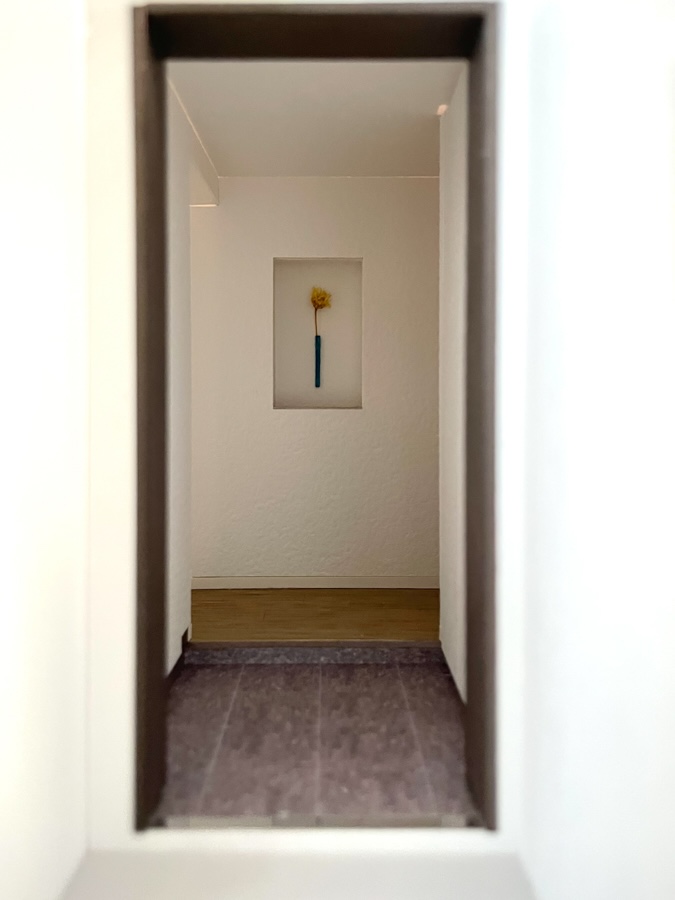 玄関に入って正面に飾り棚を設けています。そこに以前の打ち合わせでこういったものを飾りたいと見せていただいた花器を表現しました。廊下の先にはリビングダイニングのガラス戸越しに家具をや窓を見ることができます。