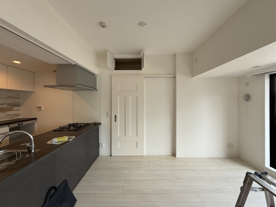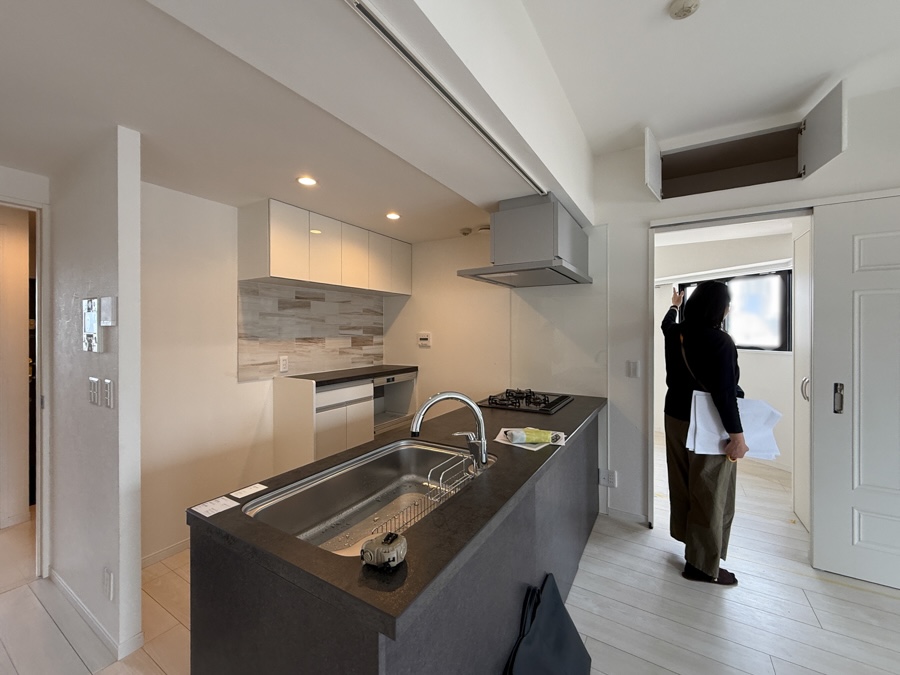 キッチンです。管理事務所に保管されていた既存図を見てみると、新築当時は壁際にシンクとガスコンロが設置されたI 型タイプで、クローズドのキッチンでした。前のオーナーさんがご購入した際にアイランド型+バックセットを設け、オープンキッチンにリフォームしたそうです。