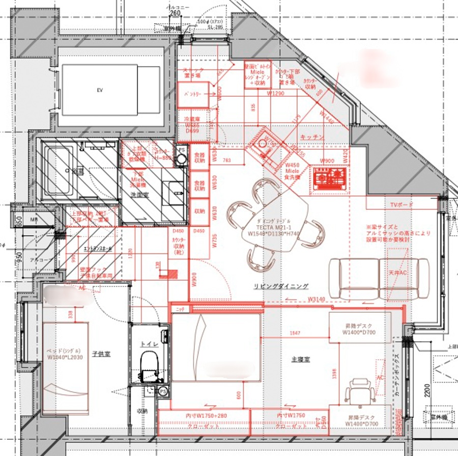 こちらは前回までのお打合せで作っていたラフプランです。図面上では成立している寸法も、実際の空間で感じる距離感や広さは異なって感じることがあります。窓との関係やキッチンとダイニングの距離、通路幅、家具の配置を一緒に確認していきました。(途中段階のプランのため、最終的な計画とは異なります)