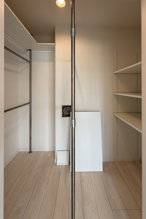 振り返ると、WICがあります。収納スペースとして確保できるのはよいのですが、限られた空間の中では収納だけしか使えないというのではなく、兼用できるような使い方を考えた方がよさそうです。