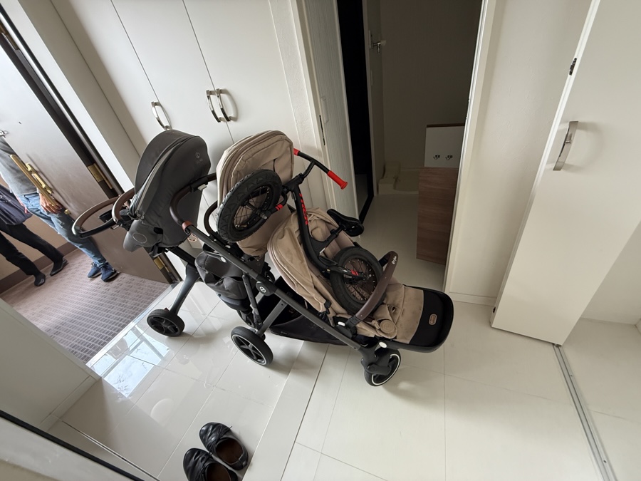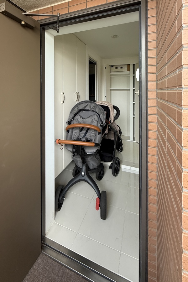 小さいお子さんと一緒に外出される時に、玄関にバギーを置く場所がほしくなります。お使いになっている数種類のバギーを実際にお持ちいただいて、玄関においてみました。せめてバギーを使っている間だけでもホールにゆとりのあるスペースがあるとよさそうです。