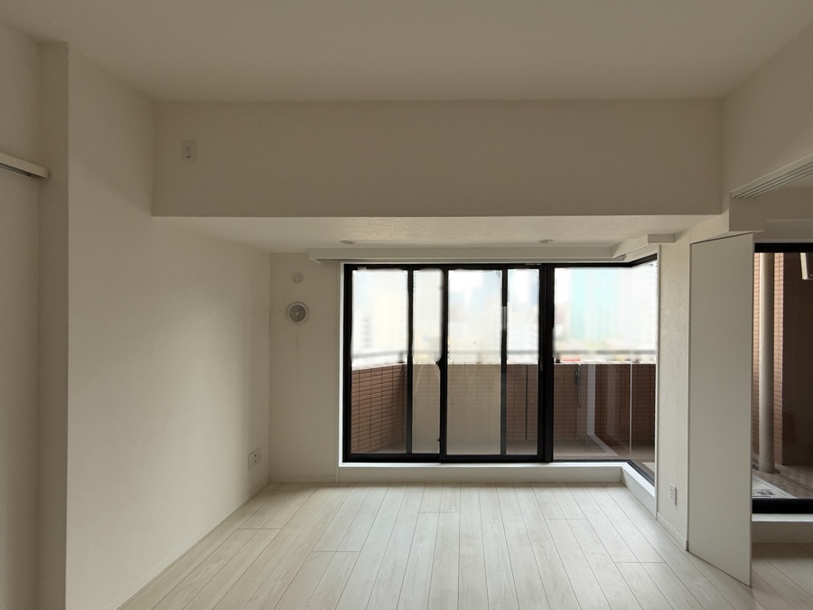 玄関ホールからLDKに入ると、正面に窓が見え、眺望の良い景色が望めます。右手にもお部屋が続き、以前のオーナーさんはここを可動間仕切りで仕切って使っていたようです。