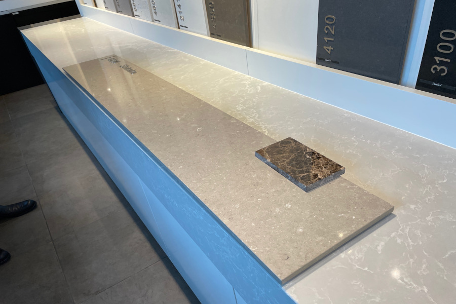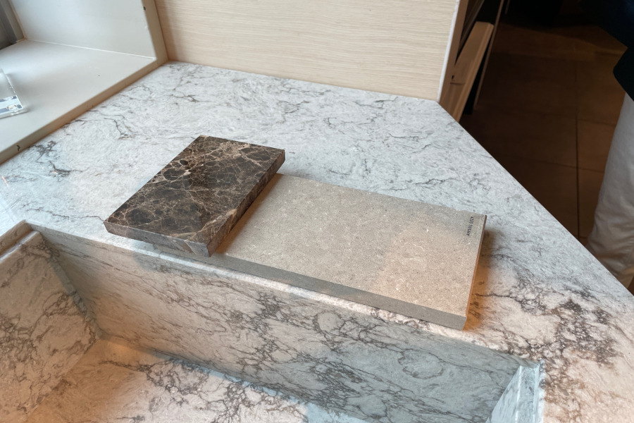 際の明るい場所に移動し色・柄を再度確認。ワークトップの上部にオーバーカウンターとしてエンペラドールダークを使うのでバランスを確認中。サンプルの下に白い洗面カウンターがありますが、これもシーザーストーンです。表情も天然石に近く、とても高級感がありますね。