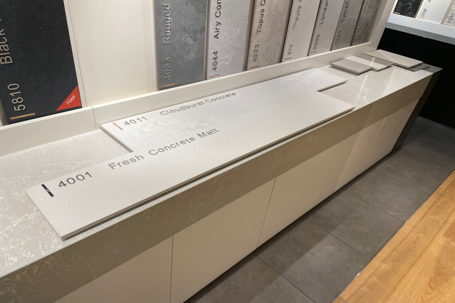 次は洗面カウンターのシーザーストーンを選定中。洗面室は北側であまり日が入らない場所なので、明るい白系を選定。ただ真っ白にしてしまうと空間に合わないため、少しくすみがあり、ほんのり石の斑が入ったものを採用します。上記の4011 Cloudburst Concrete(クラウドバーストコンクリート)に決定しました。