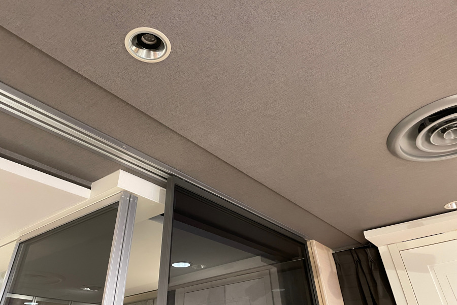 上吊りレールの納まり。天井面に上吊りレールが設置されますので結構目立ちます。レールの存在をできるだけ消す為には、納まりにひと工夫必要そうです。
