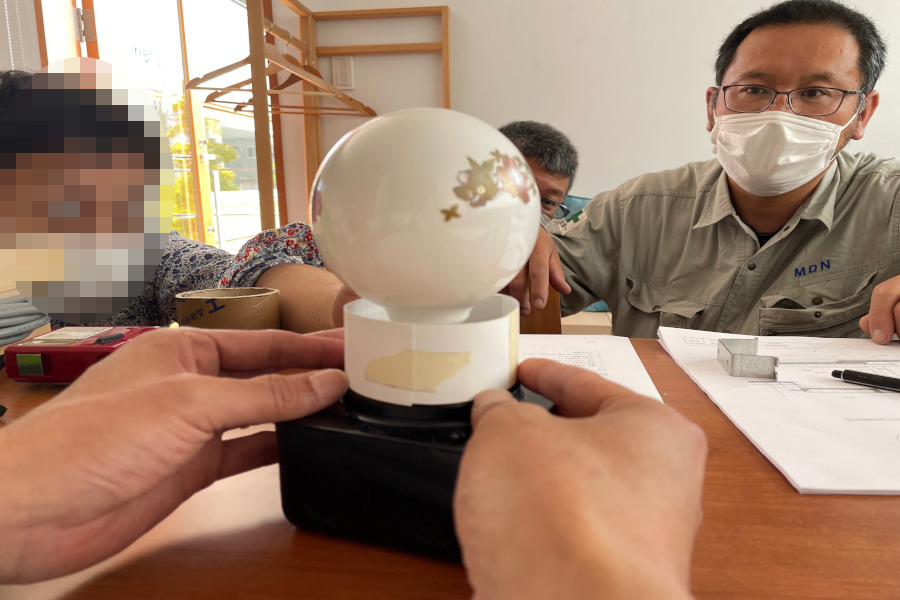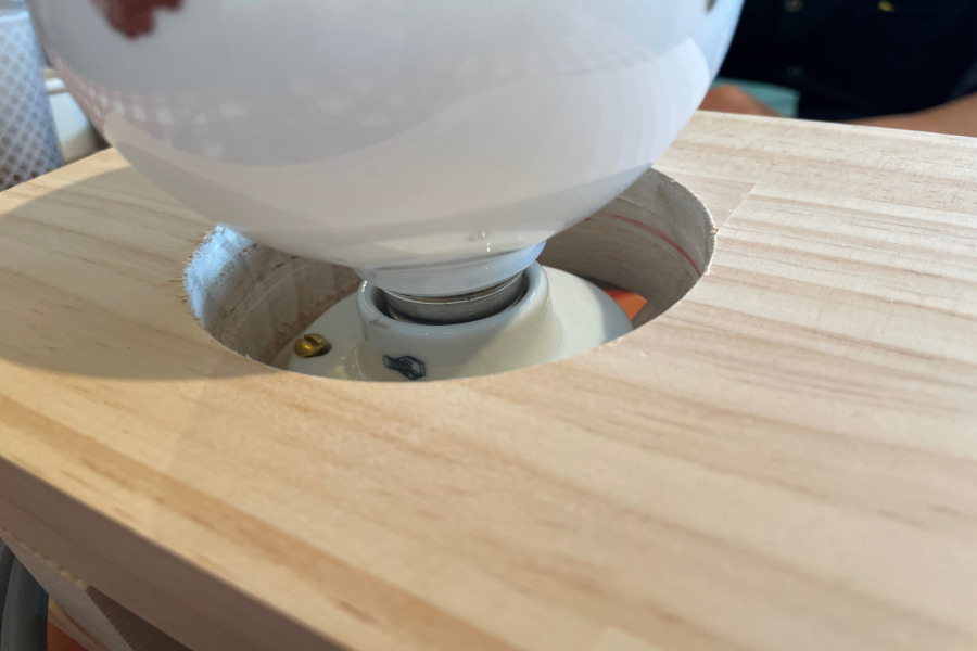 こちらは横から見た照明器具の断面写真です。ランプが取付く機械部分は陶器製の器具を採用しています。レセップと言います。写真をみるとレセップの横から配線が出ているのがわかりますが、コンクリートの箱抜き寸法をかなり大きくしないと、器具を設置する際に結線処理が難しいことがわかりました。このように原寸大の模型で確認すると物理的に施工可能かと、美しい照明器具になるかが本当にわかります。