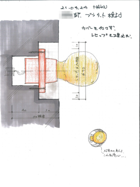 上記のスケッチはコンクリートを箱抜き(コンクリート打設時に埋込処理すること)にして、器具自体を埋込むディテールを検討しました。壁から電球のみが生えているようなデザインです。機械部分をプレートやカバーで隠すのではなく機械部分を半埋込して照明器具の存在感を消すようなディテールです。使用する電球はクリアのボール球なので点灯していない時はガラス玉が壁に張り付いているような、ある意味アートな印象です。