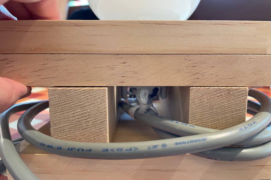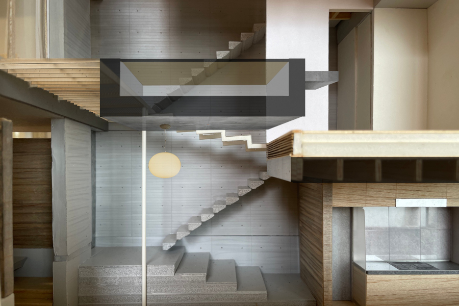 色々と設計者同士で検討している中、お施主様である電気設備設計の奥様が、なんと!!原寸大の模型を製作してくださいました!スケッチで描いた寸法通りに木材を加工してどのようにランプが見えるか、機械部分の器具がどのように見えるかなど、とても分かりやすいですね。