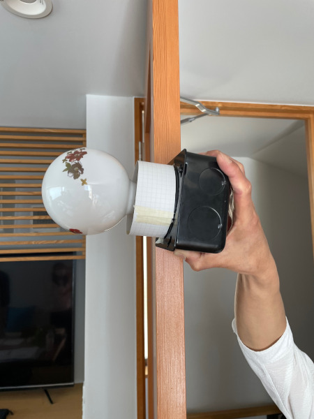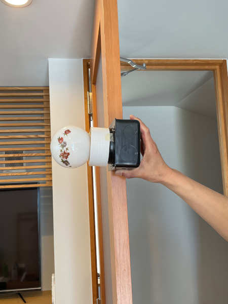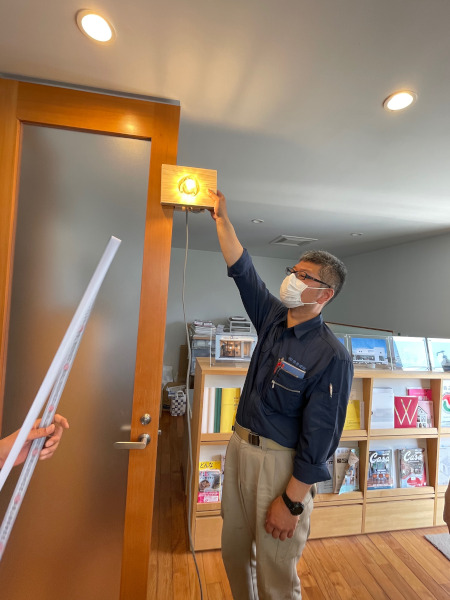 場所を変えて栄港建設さんにて点灯実験です。ここで照明の高さも確認していきます。床から約2mくらいに設置します。ブラケットライトは階段や吹抜け部分にも設置するので、目線を避けかつメンテナンスがしやすい高さに設置します。