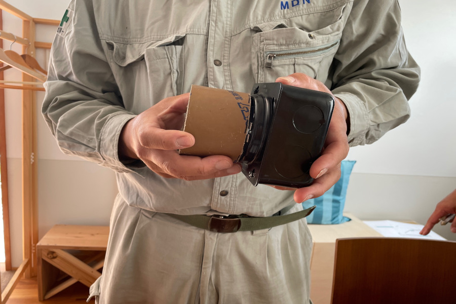 皆さんが覗き込んでいるのは横から見た時にランプがどう見えるかを確認しています。コンクリートの埋込寸法の確認です、ここでも紙を用いて原寸で確認します。埋込寸法は35mmか40mmです。mm単位で調整し一番ランプが美しく見えるように検討しました。