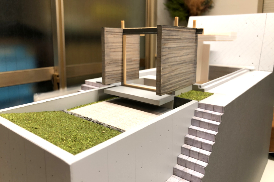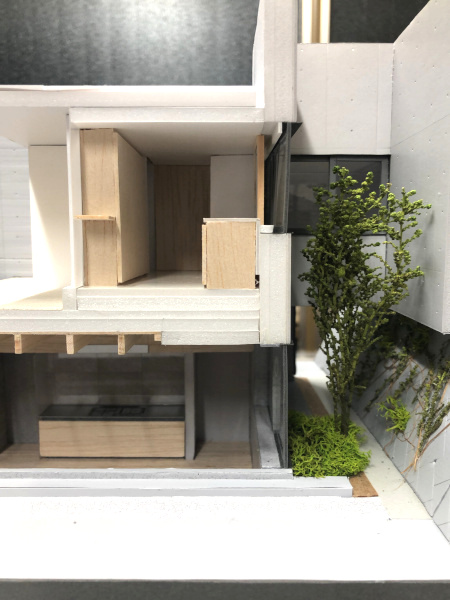 上記の写真は基本設計段階に製作した模型で、ランドスケープ(外構計画)もこの段階で検討しています。建築の空間は上下空間がズレたスキップフロアの計画なので、庭のレベルも建物より下げ、内側に傾斜した芝生をベースに多様な植栽を植える計画としています。ランドスケープも立体的にデザインすることで奥行きのある空間となります。