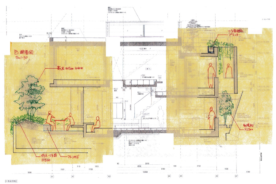 こちらはスタジオテラの石井さんの断面スケッチ。本計画の設計趣旨を説明しご提案頂きました。南側(スケッチ左側)は余白を残した立体的な庭で、北側(スケッチ右側)の屋根からツル系の植物を植え、その下には耐陰性のある中木を植えます。空間は縦横に繋がり、床や天井はスキップフロアによるスリットがたくさんあります。視線の先には光・風・水を受けた植物がキラキラと陰影をつくり、小さくとも豊かな空間になると思います。