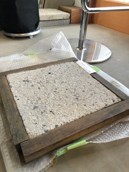 上記の石のような仕上材は、翔飛工業株式会社のEco Kawaraの製品で、南側アウトドアリビングの床材の採用を検討しています。瓦の骨材をセメントに練り込んだ舗装材です。瓦は使われなくなった廃瓦を粉砕して骨材として利用しており、非常に優れた保水性のあるリサイクル製品です。表情も素朴でそれほ主張もなく、それでいて何とも表情のある製品です。