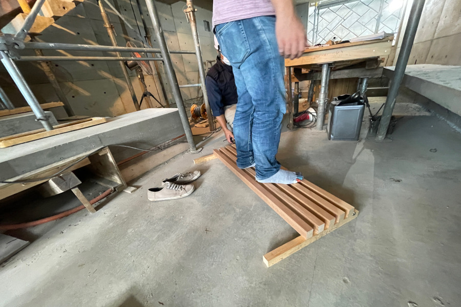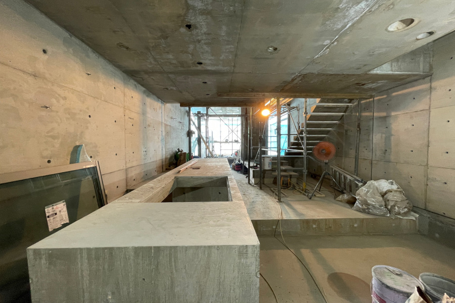 RIFF houseはキッチンワークトップやダイニングテーブル、階段・ベンチ・デスクなどコンクリート製です。そのままの仕上げでも良いと思いますが、人の手の触れるところは左官屋さんで金ゴテで平滑に仕上げをして頂きました。