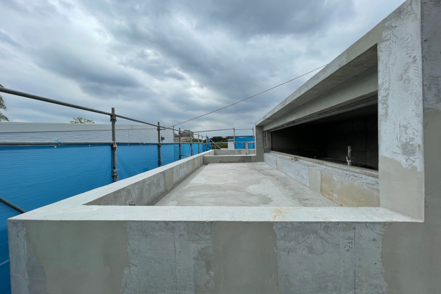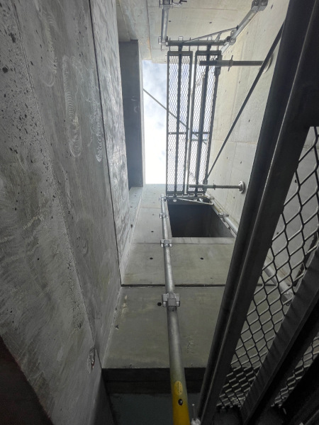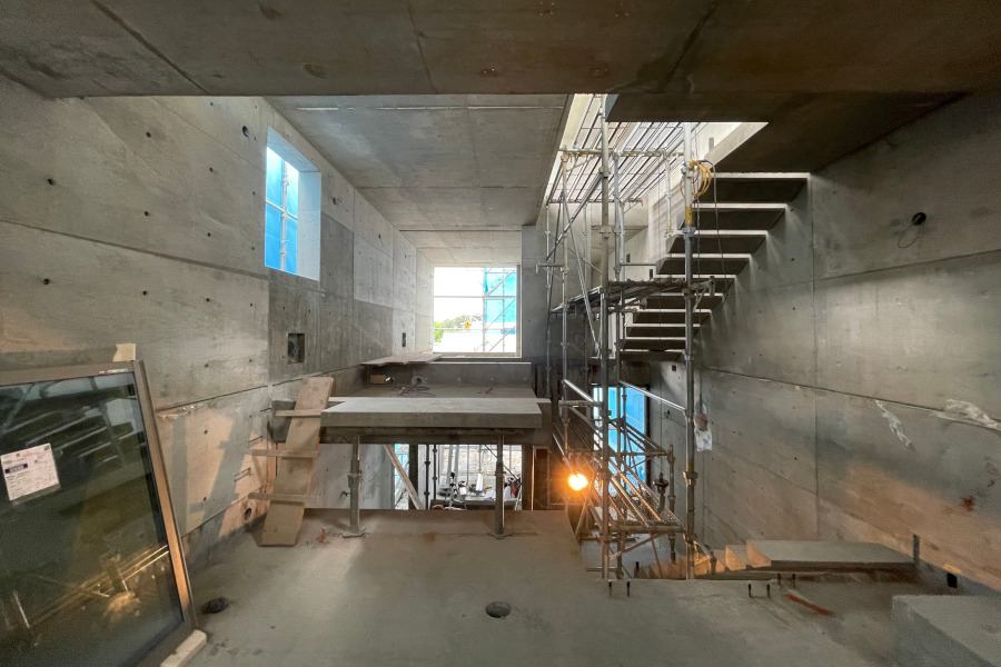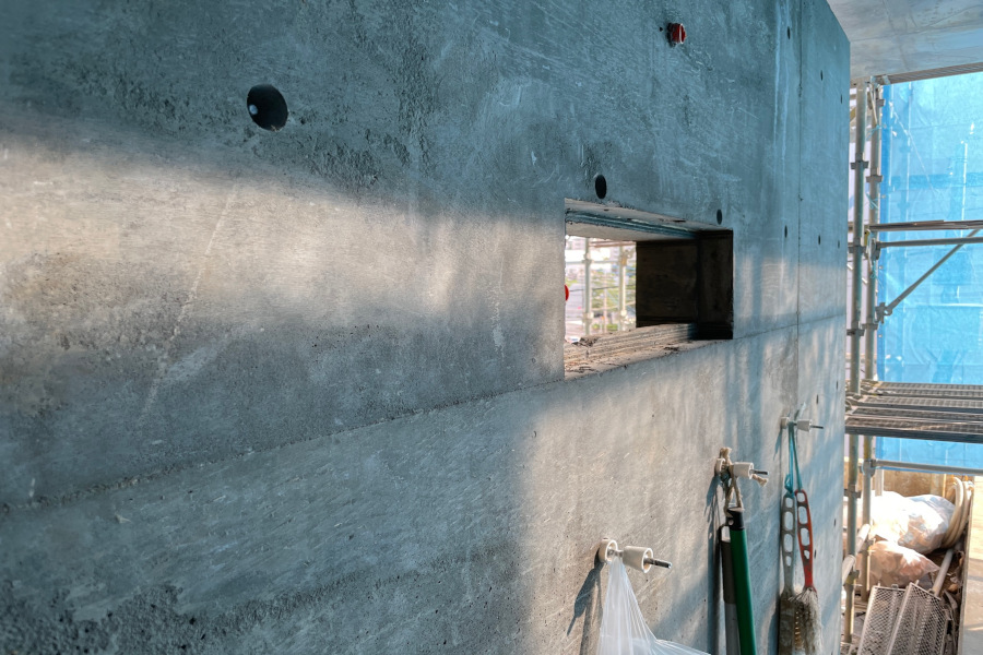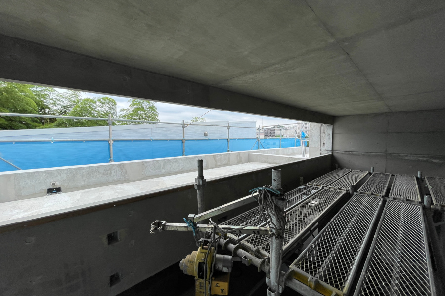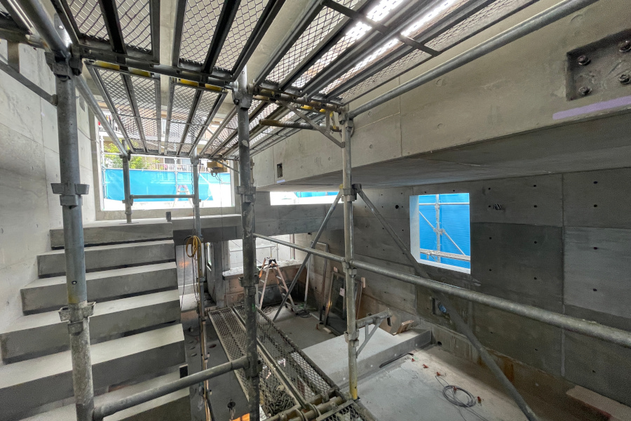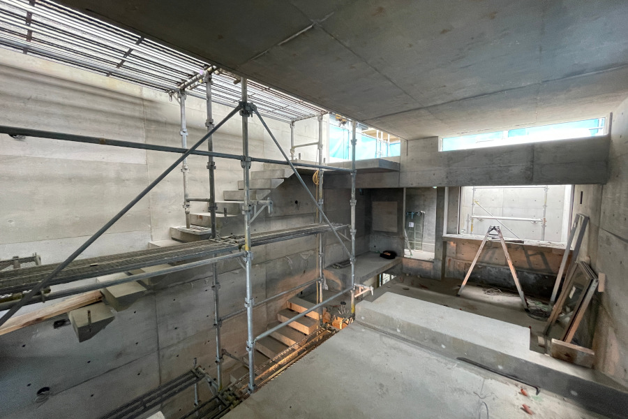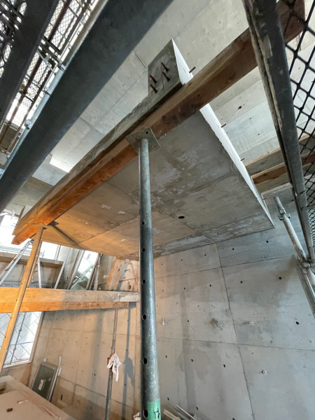 2階からルーフバルコニーへの空間。上部に足場が掛かっていますが、足場の上部がハイサイドライトです。ハイサイドライト下部のコンクリートに四角い穴が2箇所あることがわかるでしょうか?