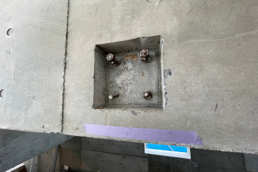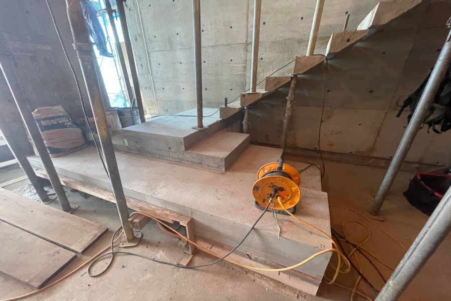 今回の計画のような小規模で複雑なコンクリート造の場合、狭い隅部などにコンクリートが完全に充填しないことがあり、そのような箇所はコンクリートを斫り(削ずること)とり鉄筋は錆止め処理を施し、新たにコンクリートを打設します。