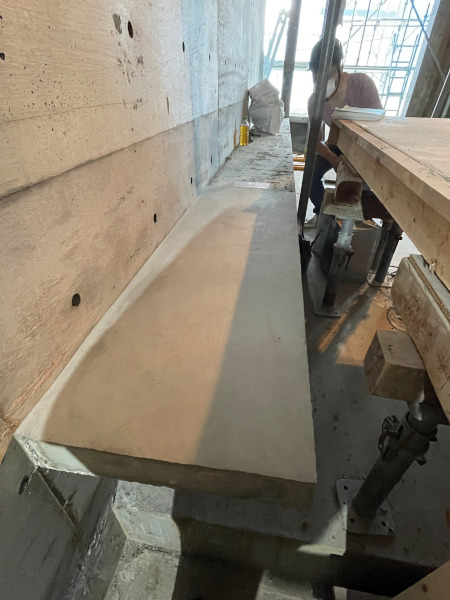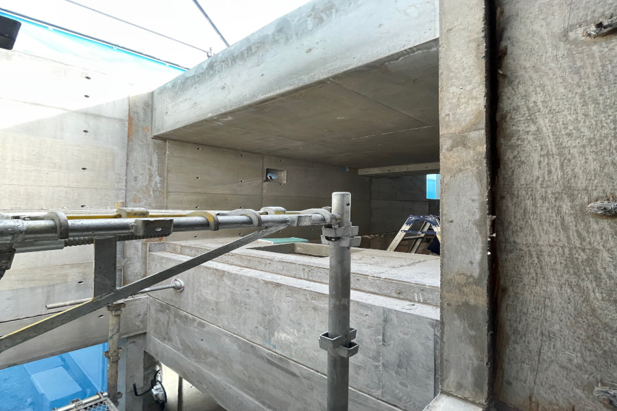 いよいよコンクリート型枠取外し(脱型)です。最後のコンクリート打設から約1か月ですが、その間に脱型は済んでおり、コンクリートの部分補修工事を実施しています。
