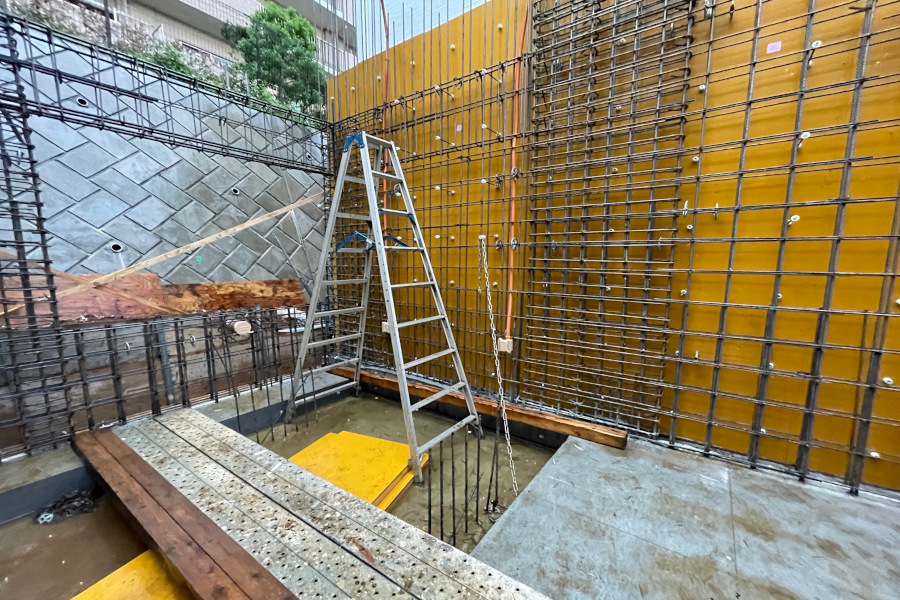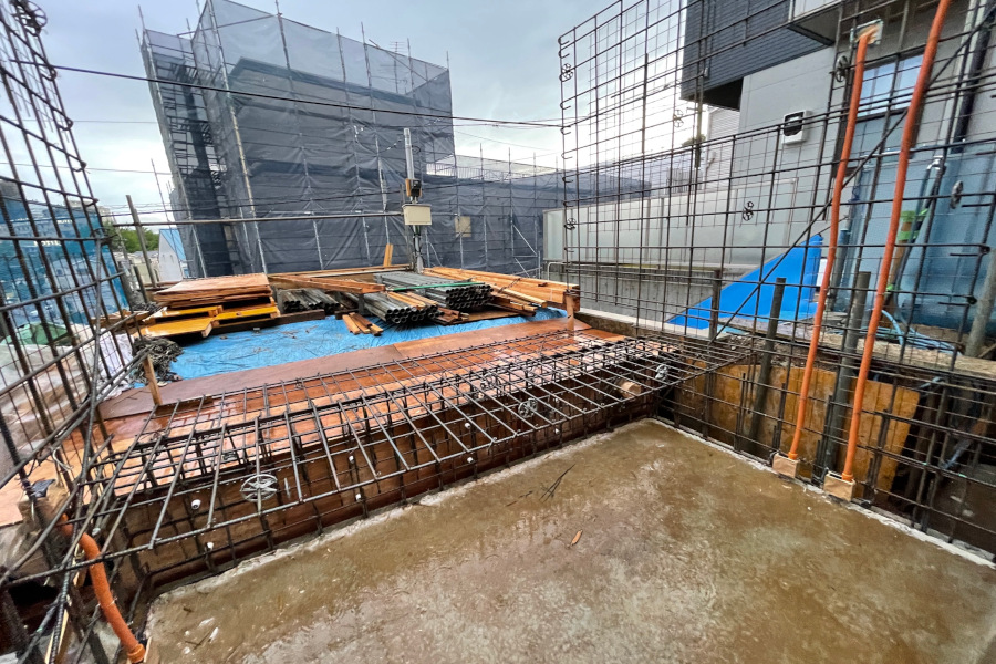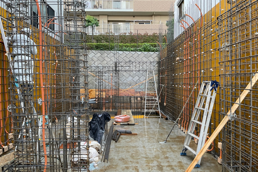 奥の鉄筋が入っていない部分はダイニングキッチンの開口部になります。北側の斜面に面しておりとても暗い空間になりがちですが、開口部上部はライトウェル(光井戸)といって屋根まで吹抜けになっています。光がガンガン降り注ぐ空間ではないのですが、光と影の移ろいで時間の流れを感じられる空間になるのではと思います。既存の擁壁はそれなりに表情があるので、あえて閉じずそのままです。