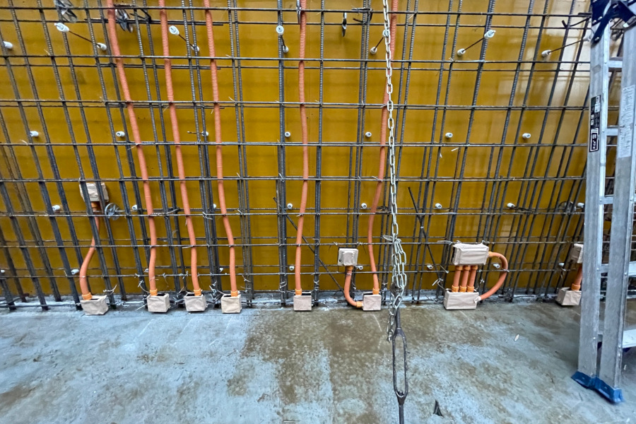 配筋検査と同時に電気・機械設備の配管・スリーブ設置の確認もしました。コンクリート造なのでコンセントやスイッチは全てコンクリート内に打ち込みます。コンクリートの壁内を通って上下階に展開します。コンクリート造の場合、この位置がズレたり確認を怠ったりすると取り返しがつかなくなるので、入念にひとつひとつ確認していきます。