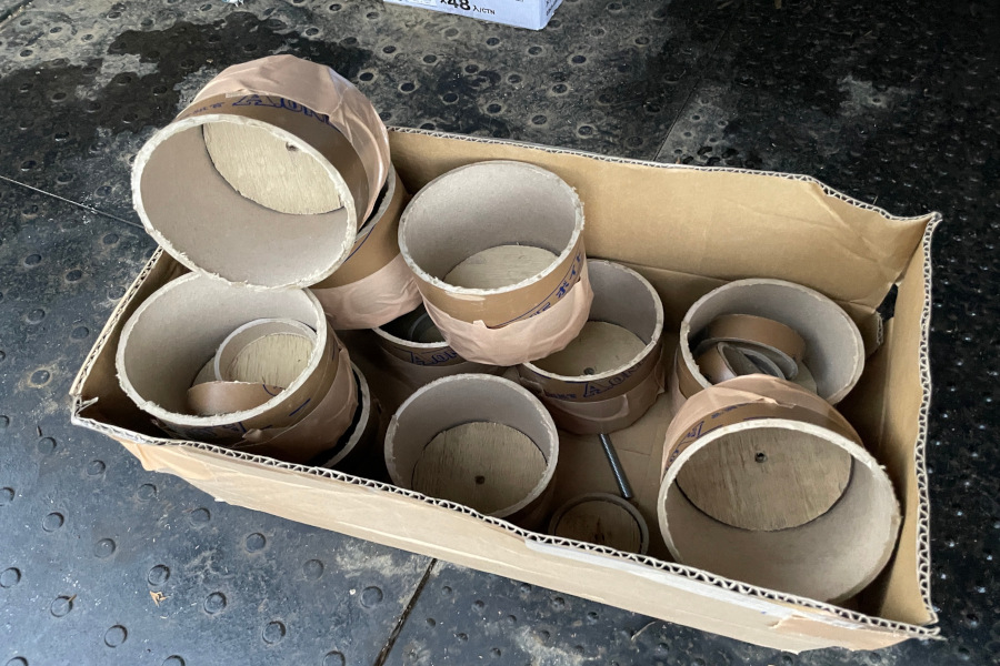 こちらは天井に取付くダウンライト埋込用のスリーブ材です。通常は天井ボードに穴をあけてのダウンライトを設置しますが、コンクリート打放しの場合はそうもいきません。ダウンライトのフェイスリムが見えてしまっては台無しなので、本計画はダウンライトも埋込です。照明はとても大事な要素ですが、ダウンライト等のベース照明の場合、照明が消えている時こそ存在感のない工夫をしなければなりません。この納まりは脱型(型枠外し)後のお楽しみで。。