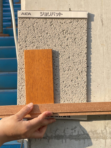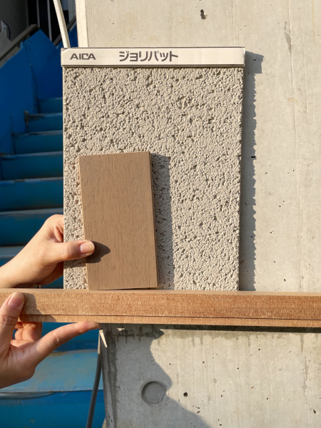 最後は木製サッシの木部の色の確認です。建物は外断熱仕様なので仕上げをしなければなりません。少し明るめなグレー系の左官材に合うサッシ木部の塗装を確認しています。写真の一番後ろが左官壁、真ん中が木製サッシの色、手前の細長い材が内部の枠材です。ということで一目瞭然少しスモーキーな色合いの写真上段の組合せで確定です。