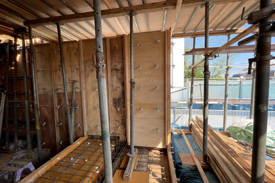 1階床に続き2度目の配筋検査です。今回は1階壁から2階の床の配筋検査です。1階壁はすでに検査を完了しており、内側の型枠がすでに立ち上がっております。