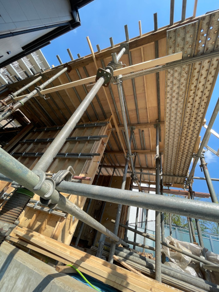 1階ダイニングから南側リビング方向を見る。2階の床を支える支保工という仮設の柱が乱立しております。コンクリートの床は相当な重量となりますので、台木を添え等間隔に支保工を設置します。階段の型枠もできていますね。