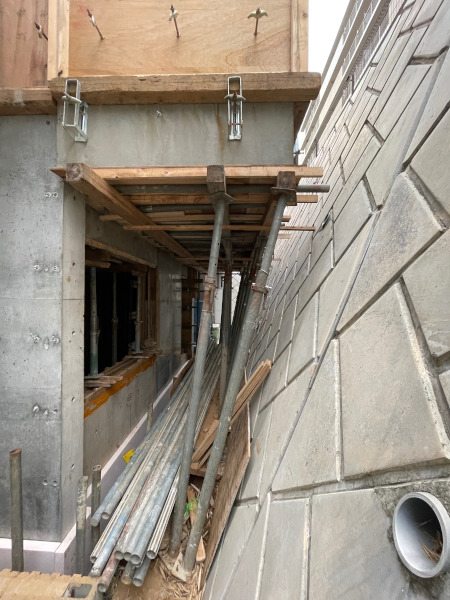 2階床の模様。前回ブログでも書きましたが床レベルが複雑ですね。右側床の足場があるところは上下を繋ぐ階段エリアで、左側のエリアがお子様のお部屋です。宙に浮いているコンクリートはデスクになります。