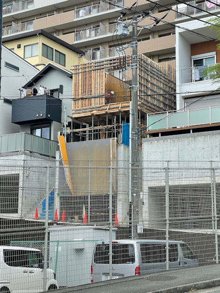 先日打設したコンクリートの型枠が外されています。緊張感のあるツルっとしたコンクリート打放ではなく、程よくラワン合板型枠の木地が出ていますね。光の移ろいがやわらかく陰影をつくりだしてくれると思います。