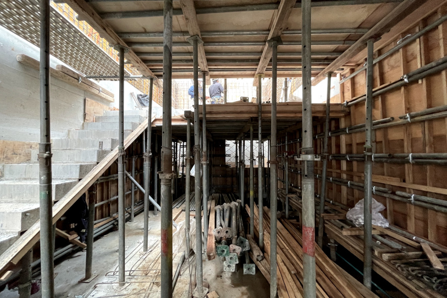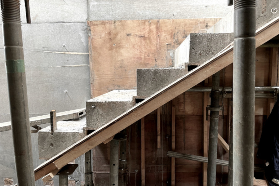 先日の打設後に姿を現したコンクリートの片持ち階段。まだ底面の型枠を外すことはできませんが、段の隙間から光が下階に落ちます。光と影の陰影が美しい空間になります。