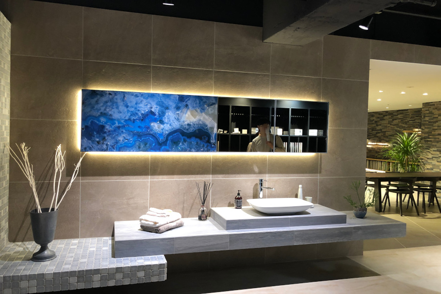 まずは赤坂にあるショールーム、石やタイルなどの建築資材を扱うリビエラです。事前にサンプルを送ってもらい候補を決めて実物大のサンプルを確認します。