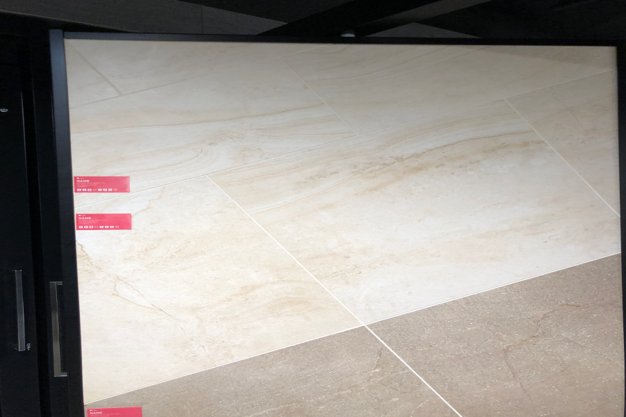 床・壁のタイルの確認。ライムストーンのような自然な風合いのタイルです。上記のようなベージュ系またはグレー系で進めていくことで決定しました。