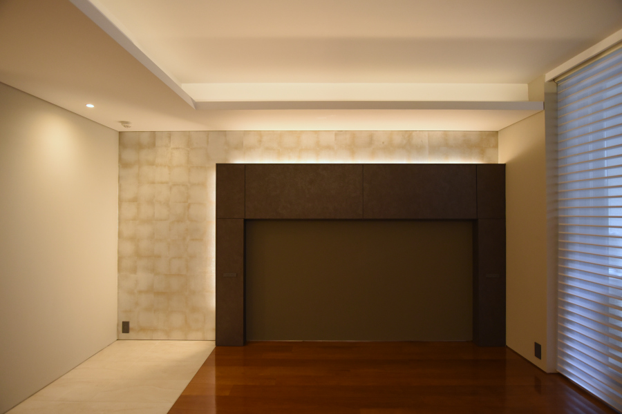 寝室のヘッドボード。銀箔和紙壁紙とレザーシート貼りの構成。壁に奥行きを付け間接照明を仕込むことで、立体的な壁面になりました。