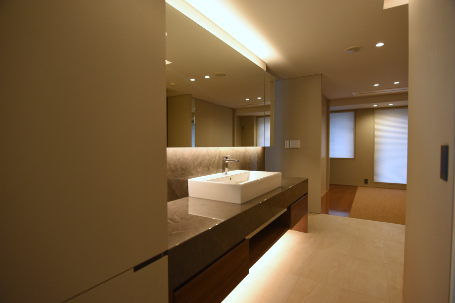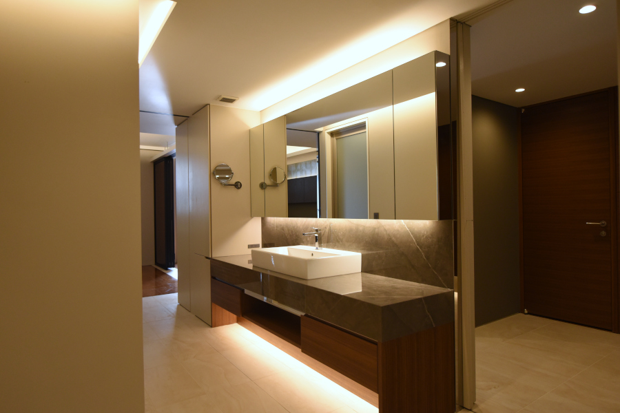 洗面室はどこからでもアクセスできるようガラス戸で仕切ることで、回遊性のある空間を作り出しています。