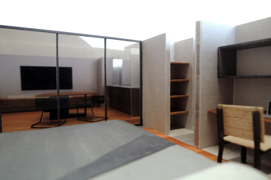 シーンによってガラス間仕切り戸を開放し一体空間とすることで、空間に広がりをもたせつつ、空気だけでなく、気配も感じられるよう計画しました。