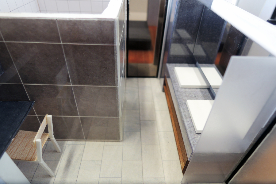 洗面室は寝室(奥)からも玄関(右手)からもアクセスできるように、既存間仕切り壁を撤去しガラス間仕切り戸で緩やかに仕切っています。