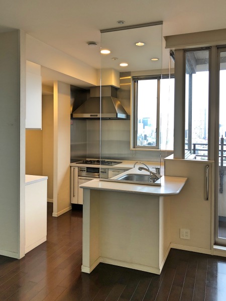 ただ、シンク脇のカウンターはそこで食事ができる広さでもなく、ガラスのスクリーンがあることで使い方も限定されてしまうため、キッチンカウンターとフラットにして拡張する計画にします。